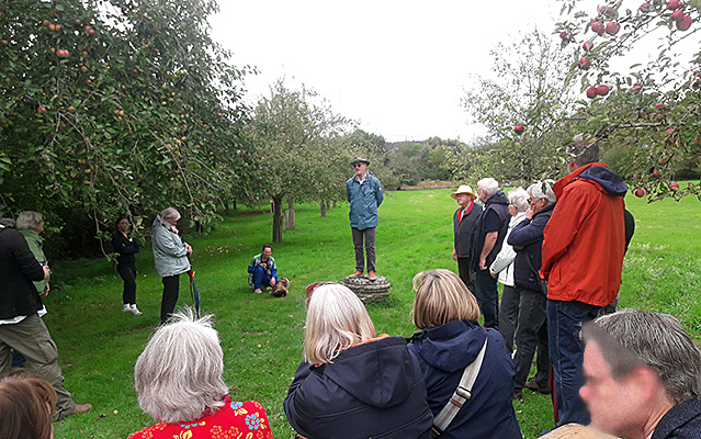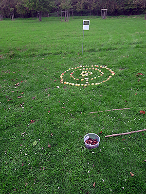 Auf einer im Vergleich zum Sommerfest leicht reduzierten Budenstraße wurden kleine Speisen und Getränke sowie diverse Produkte aus Pflanzen angeboten. Links: Ein aus Äpfeln und Rosskastanien improvisiertes Wurfspiel.