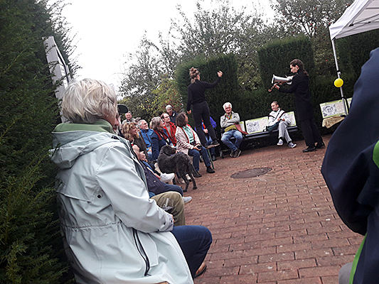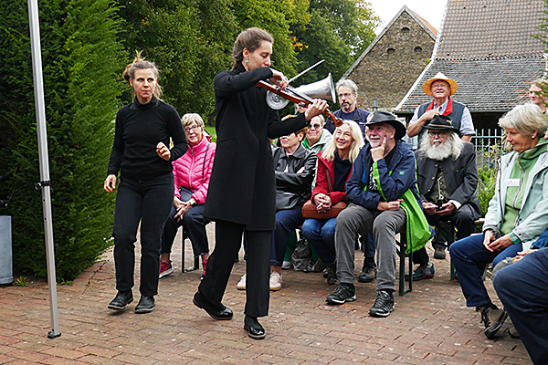 Im Karlsgarten zeigten Bianka Elberfeld (links) und Huda Knobloch (rechts an der Trichtergeige) eine Performance frei nach "Der Ohrenzeuge" von Elias Canetti, bei der auch das Publikum intensiv einbezogen wurde.