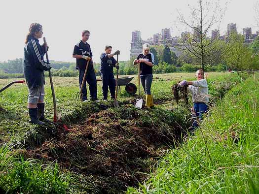 In Absprache mit der Unteren Wasserbehörde und dem Wasserverband Eifel-Rur wurden im ersten Arbeitsschritt die Holzverschalungen und das Vlies der Sohlauskleidung entfernt. Danach wurde an einigen Stellen die Uferböschung des Dorbachs schräg buchtenförmig abgegraben. Auf diese Weise kann der Bach bei starker Wasserführung rechts und links des zur Zeit gradlinigen Verlaufs sein Bett zwischen dem Zulauf und Rücklauf des Teiches in Mäanderschleifen ausbilden. Die Bilder zeigen SchülerInnen der Pestalozzi-Schule bei den Arbeiten zum naturnahen Unterhalt am Dorbach