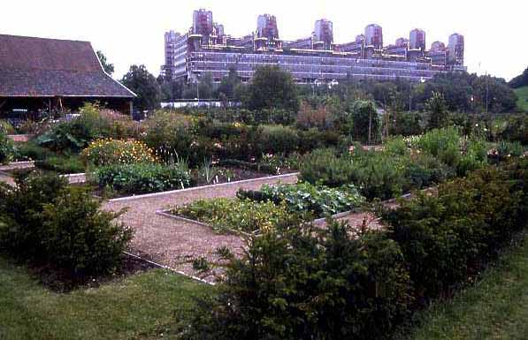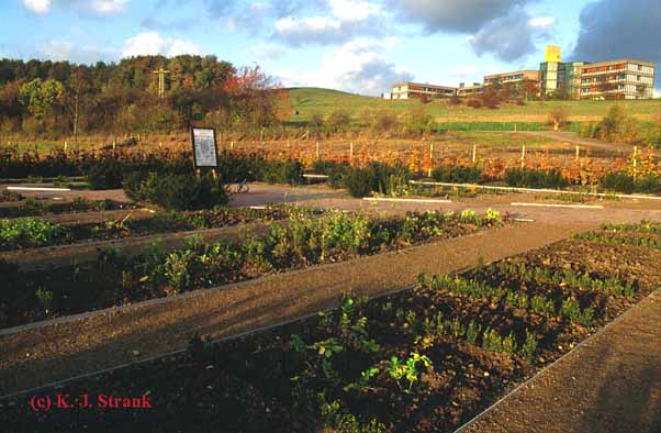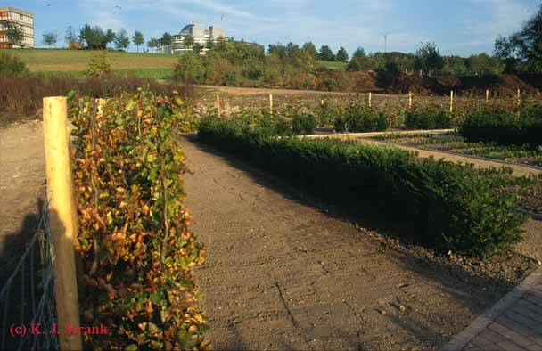 Der Blick über die Beete in Richtung Computermuseum (oben) und Wilkensberg (unten) im Zustand vom Herbst 1999.