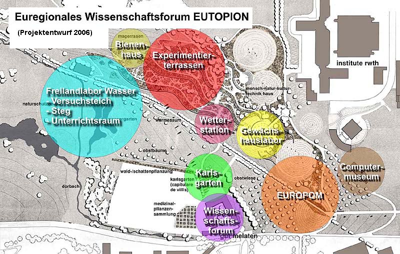 EUTOPION war als gemeinsames Projekt von RWTH Aachen und Freundeskreis Botanischer Garten Aachen e.V. für die EuRegionale 2008 beantragt. Die Gesellschafter der EuRegionale 2008 haben am 12.01.2006 EUTOPION mit dem Label ausgezeichnet. Wie bei anderen EuRegionale-Projekten auch, wurden Planungen und Organisation nicht zum EuRegionale-Jahr fertig. Absprachen des Freundeskreises und der RWTH sind aber erfolgreich fortgeführt worden.