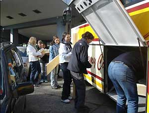 | Voller Vorfreude erwarteten wir um 10 Uhr den Bus, der uns vom Gebäude für Bauingenieurwesen in Aachen über Lüttich nach Luxemburg bringen sollte. Doch bevor wir starten konnten, musste noch das Baumaterial für unseren Karlsgarten in Luxemburg im Bus verstaut werden. |