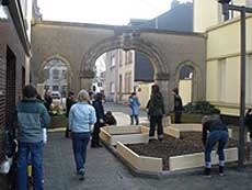 | Früh aufstehen, duschen, frühstücken und los ging's um 10 Uhr nach Luxemburg. Im Materiallager in der Rotunde 2 konnten wir uns „gartenfertig“ machen und uns mit Schaufeln bewaffnen. Dann haben wir uns auf den Weg zu dem Platz gemacht, an dem wir den Garten bauen sollten. Unser Weg war der kürzeste von allen Gruppen, nach 5 Minuten waren wir da. Das Baumaterial wurde auch sofort geliefert, so dass wir direkt anfangen konnten. Zum Glück hatte die Stadt das ca. 4 x 5 m große Beet, das bis dahin als Hundetoilette benutzt wurde, gesäubert! Zuerst musste etwas von der Erde abgetragen werden bevor wir die vorbereiteten Bretter einsetzen konnten. Wir hatten nämlich geplant, den Garten in 4 Bereiche zu teilen, die den Elementen Erde, Feuer, Wasser und Luft zugeordnet sind. Dort sollten später dazu passende Pflanzen eingesetzt werden, die Kaiser Karl in seiner Landgüterverordnung genannt hatte. In der Mitte ließen wir Platz für einen Weg, auf dem die Signatur Kaiser Karls mit Pflastersteinen nachgebildet werden sollte. |