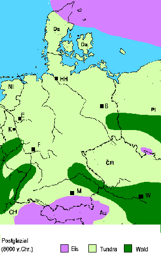 Schwermetallrasen sind ein Relikt der eiszeitlichen Tundrenflora. Dies wurde in einem einführenden Vortrag mit Grafiken von der Situation in der Eiszeit bis zur heutigen Vegetation demonstriert. Die Abbildung links zeigt z.B. das Postglazial, als die ersten Bäume wieder nach Mitteleuropa zurückwanderten.