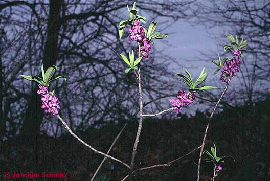 Der Seidelbast (Daphne mezereum) hat eigentlich eine größere ökologische Amplitude, kommt aber heute fast nur noch in Kalkbuchenwäldern vor. Auf der Wanderung konnten mehrfach blühende Exemplare angetroffen werden.