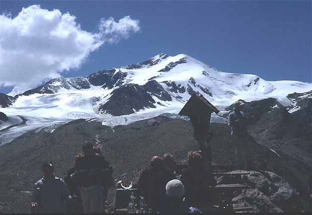 Aussicht von der Martellhütte: Oben fällt der Blick in Richtung Südwesten auf die 3757m hohen Zufallspitzen, nach Westen schließt sich rechts die Suldenspitze an. Das "kleine Matterhorn" in Bildmitte ist übrigens der Innere Kofel, der näher liegt und deshalb den Hauptkamm scheinbar überragt.