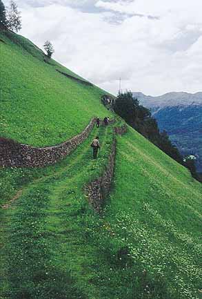 Rechts: Typisch für das Etschtal und seine Seitentäler sind die ziemlich steilen Hänge, die z.T. sogar noch bewirtschaftet werden.