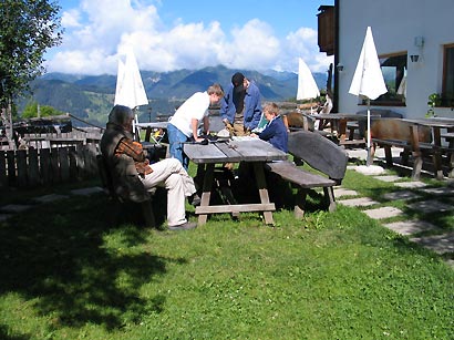 Der nächste Tag stand als Ruhetag zur freien Verfügung. Wer wollte, konnte z.B. von der Terrasse unseres Gasthofes das Bergpanorama genießen. Die jüngeren Exkursionsteilnehmer haben sich wohl doch eher für ein Asterix-Heft interessiert.