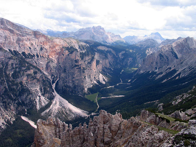 Wengen liegt in einem Seitental des Gadertals, das seinerseits nach Norden im Pustertal mündet. Das Haus ganz links (in etwa 1/3 Bildhöhe) war unsere Unterkunft, der Berggasthof Ciurnadù. Rechts erhebt sich der Kreuzkofel, an seiner linken Flanke liegt das das Val de Fanes, das über die Antoniusscharte ins Fanes-Gebiet führt, das Schauplatz von uralten ladinischen Sagen und Mythen ist.