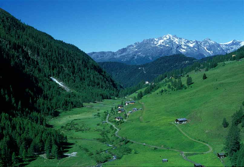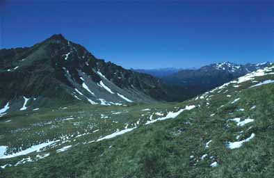 Das Astental ist ein Hochtal im Kärntner Teil des Nationalparks Hohe Tauern. Der Talschluss liegt etwa 1800 m über Meereshöhe. Hier, etwas verdeckt neben dem weißen Haus ganz hinten, bezog die kleine Exkursionsgruppe in einem Alpengasthof Quartier. Der Blick geht nach Süden in Richtung der Schober-Gruppe im Hintergrund.