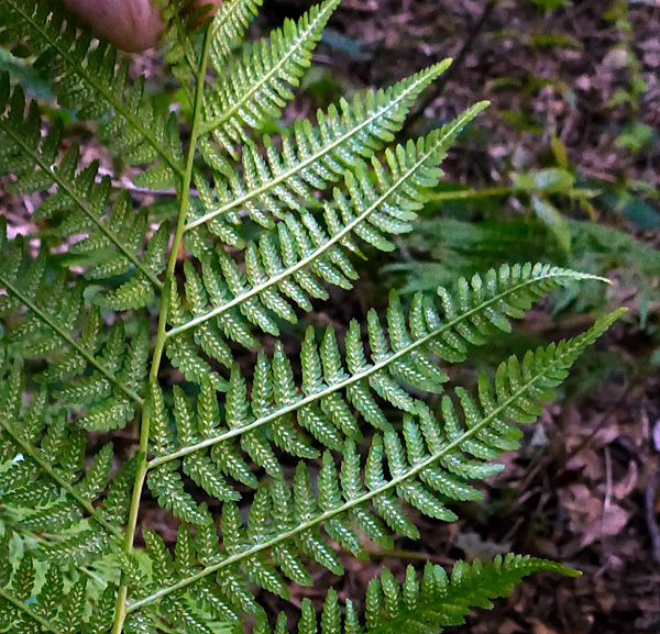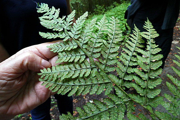 Als Erstes wurde der Wald-Frauenfarn (Athyrium filix-femina) angetroffen. Bei Farnen ist das definitve Unterscheidungsmerkmal die Anordnung der Sporenkapseln auf der Blattunterseite. Die sind zwar selbst mikroskopisch klein, aber so zahlreich, dass diese Häufchen oft mit bloßem Auge erkennbar sind. Beim Frauenfarn sind sie länglich-strichförmig (Abb. unten).