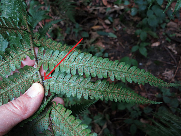 Ziemlich selten und die größte botanische Rarität des Aachener Stadtwalds ist dagegen Borrers Schuppen-Wurmfarn (D. borreri). Der umständliche deutsche Name kommt daher, dass die Art früher unter der Sammelart Schuppen-Wurmfarn (D. affinis) subsumiert wurde. Eindeutiges Unterscheidungsmerkmal gegen den Gewöhnlichen Wurmfarn ist die schwarze Basis der Fiederstielchen (roter Pfeil).