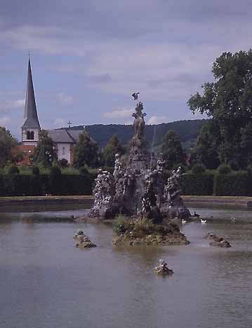 Rechts: Der sog. Läuterungssee im Rokokogarten des Schlosses Veithöchheim als Ort der Erlösung und Pforte zum Paradies.