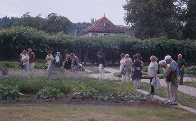 Unten: Teilnehmer der Exkursion im Küchenkräutergarten des Schlosses Veitshöchheim.