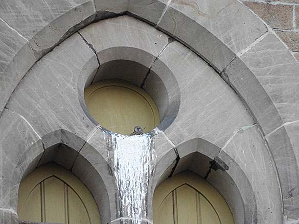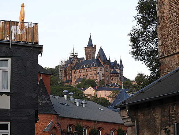 Am Abend hatten wir noch eine Stadtführung in Werningerode. Links der Blick auf das Schloss. In den Fensterbögen der St. Sylvestri-Kirche brüten Turmfalken.