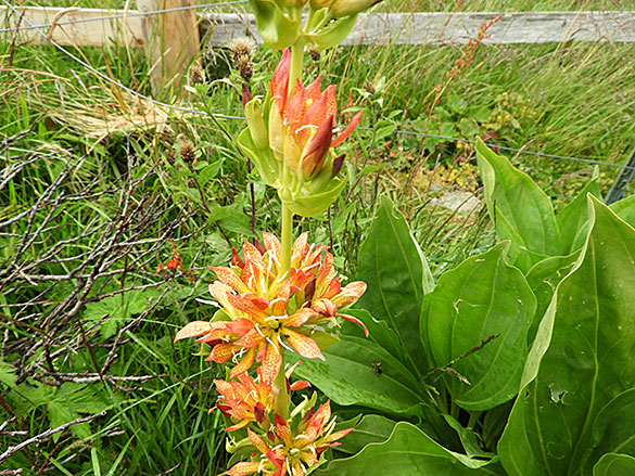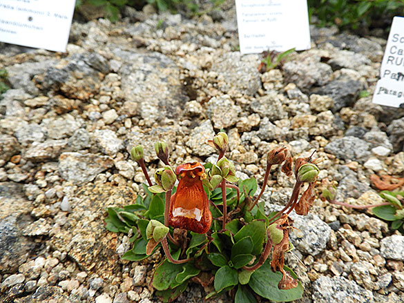 Oben links: Brockenbahn; oben rechts: Brockenplateau mit Brockenherberge (links), Telekom-Funkturm und Brockenhaus „Mosche“, ehemals Stasi-Abhörzentrale (rechts); Mitte links: Brockengarten mit Gärtnerhaus; Mitte rechts: auf dem Brocken entstandener Bastard von Gentiana lutea x pannonica; unten links: Calceolaria uniflora f. darwinii aus Patagonien; unten rechts: der reichhaltige und gut gepflegte Schaugarten überraschte viele Teilnehmer*innen.