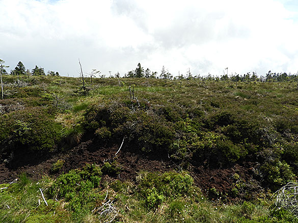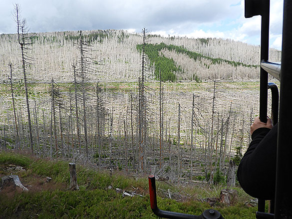 Oben links: Fichte im Brockengarten; oben rechts: Toter Fichtenwald am Hang des Brockens; unten links: Granitblöcke und Wollsackverwitterung; unten rechts: Randgehänge des Brockenhochmoors.