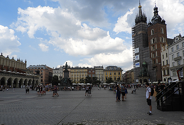 Stadtführung in der Altstadt von Krakau: Der Rynek, Marktplatz, von Krakau und unten der Wawel, der Burgberg mit Schloss und Kathedrale.