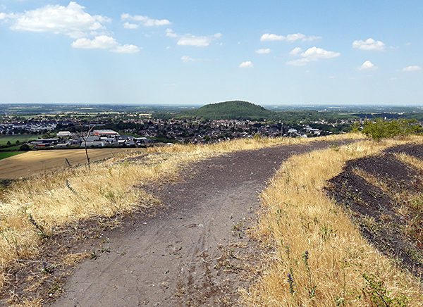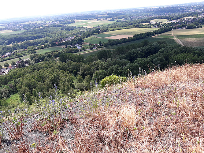 Von der Hochfläche gibt es eine hervorragende Aussicht in alle Richtungen. Oben bilden im Südwesten der Aachener Stadtwald und das niederländische Heuvelland den Horizont. Unten geht der Blick Richtung Merkstein mit der markanten Halde ADOLF.